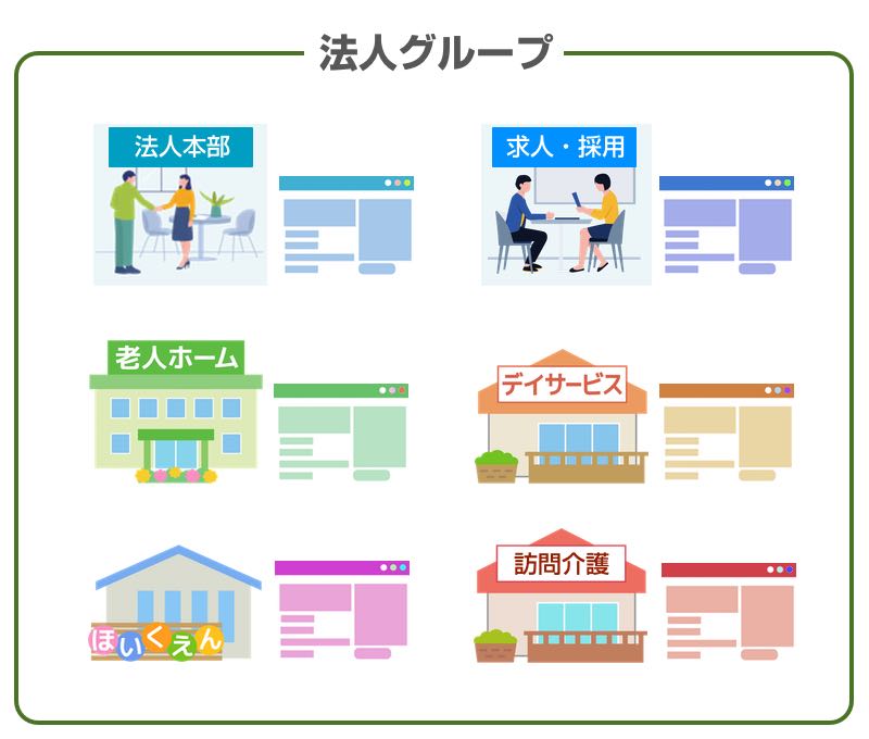 法人本部がある社会福祉法人では法人本部がWEBページ全体を管理し、下層ページもしくはサブドメインで老人ホームや保育園などの施設ページを用意することができます。